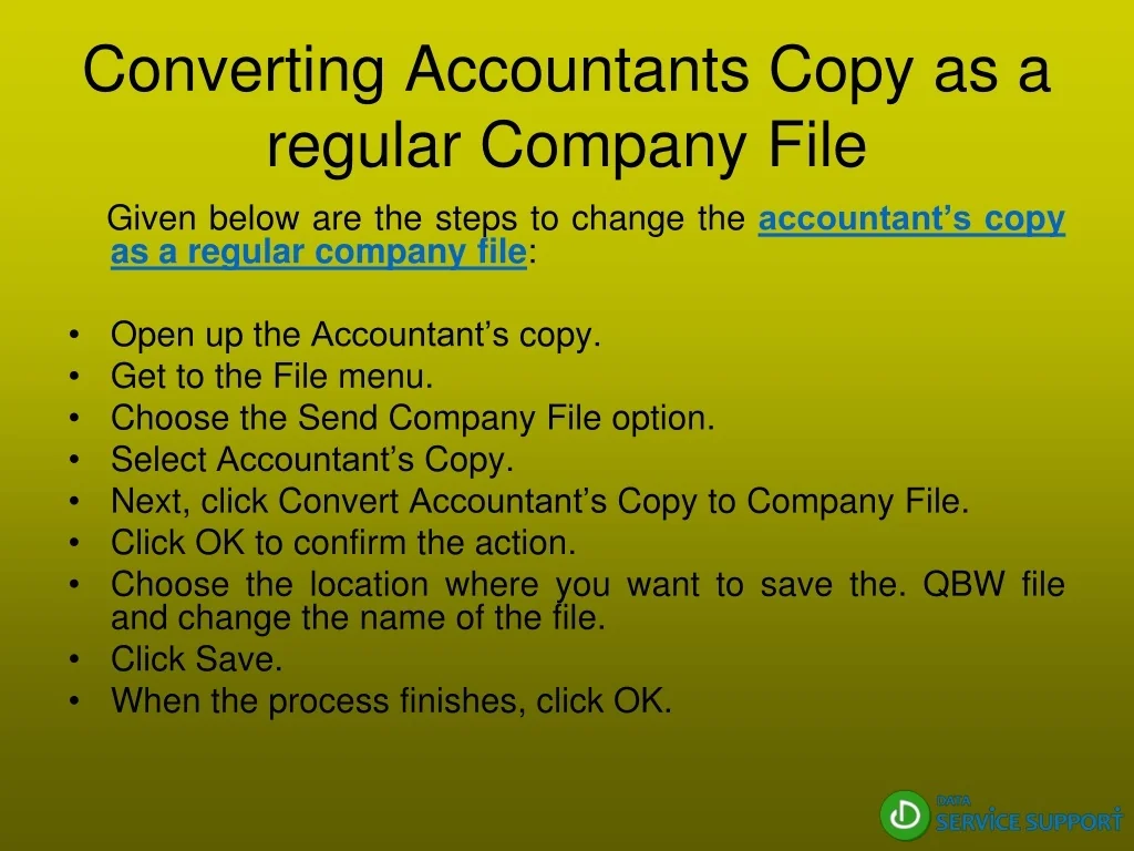 How to Convert Accountants Copy As A Regular Company File While working on QuickBooks, sometimes the company file gets damaged and users want to record the transactions without any restrictions and need to change the accountant’s copy as a regular company file. It can only be converted in QuickBooks Desktop Premier Accountant and Enterprise Accountant. This blog will brief you with the steps to convert QuickBooks accountant copy to a regular company file. So, read carefully until the end. If you’re experiencing any problem while converting QuickBooks Accountant’s copy as the Company File, then get in touch with the certified QuickBooks professionals by dialing us on our helpline number (855)-526-5749