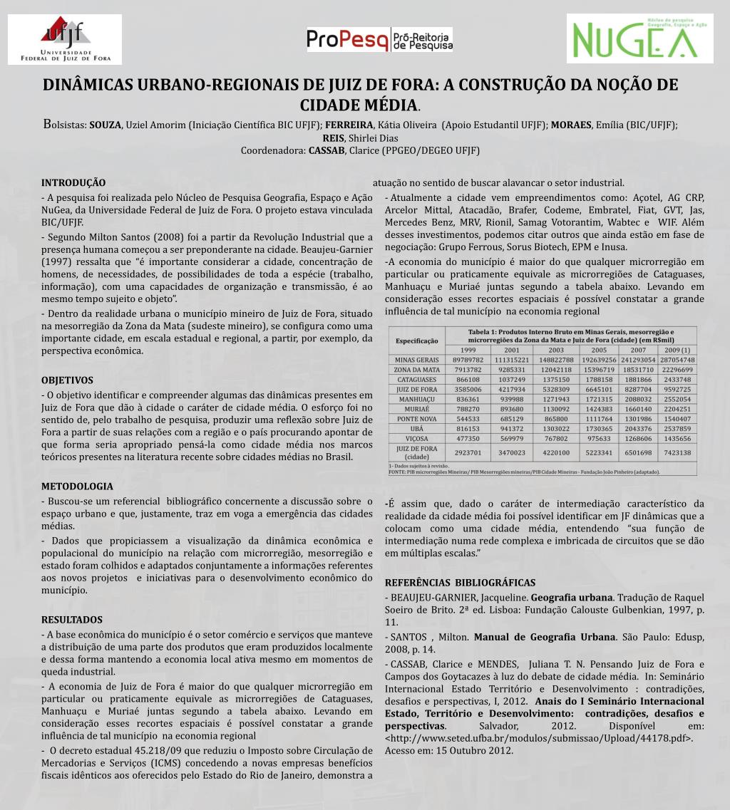 DINÂMICAS URBANO-REGIONAIS DE JUIZ DE FORA: A CONSTRUÇÃO DA NOÇÃO DE CIDADE MÉDIA.Bolsistas: SOUZA, Uziel Amorim (Iniciação Científica BIC UFJF); FERREIRA, Kátia Oliveira (Apoio Estudantil UFJF); MORAES, Emília (BIC/UFJF); REIS, Shirlei Dias Coordenadora: CASSAB, Clarice (PPGEO/DEGEO UFJF) INTRODUÇÃO - A pesquisa foi realizada pelo Núcleo de Pesquisa Geografia, Espaço e Ação NuGea, da Universidade Federal de Juiz de Fora. O projeto estava vinculada BIC/UFJF. - Segundo Milton Santos (2008) foi a partir da Revolução Industrial que a presença humana começou a ser preponderante na cidade. Beaujeu-Garnier(1997) ressalta que “é importante considerar a cidade, concentração de homens, de necessidades, de possibilidades de toda a espécie (trabalho, informação), com uma capacidades de organização e transmissão, é ao mesmo tempo sujeito e objeto”. - Dentro da realidade urbana o município mineiro de Juiz de Fora, situado na mesorregião da Zona da Mata (sudeste mineiro), se configura como uma importante cidade, em escala estadual e regional, a partir, por exemplo, da perspectiva econômica. OBJETIVOS - O objetivo identificar e compreender algumas das dinâmicas presentes em Juiz de Fora que dão à cidade o caráter de cidade média. O esforço foi no sentido de, pelo trabalho de pesquisa, produzir uma reflexão sobre Juiz de Fora a partir de suas relações com a região e o país procurando apontar de que forma seria apropriado pensá-la como cidade média nos marcos teóricos presentes na literatura recente sobre cidades médias no Brasil. METODOLOGIA - Buscou-se um referencial bibliográfico concernente a discussão sobre o espaço urbano e que, justamente, traz em voga a emergência das cidades médias. - Dados que propiciassem a visualização da dinâmica econômica e populacional do município na relação com microrregião, mesorregião e estado foram colhidos e adaptados conjuntamente a informações referentes aos novos projetos e iniciativas para o desenvolvimento econômico do município. RESULTADOS - A base econômica do município é o setor comércio e serviços que manteve a distribuição de uma parte dos produtos que eram produzidos localmente e dessa forma mantendo a economia local ativa mesmo em momentos de queda industrial. - A economia de Juiz de Fora é maior do que qualquer microrregião em particular ou praticamente equivale as microrregiões de Cataguases, Manhuaçu e Muriaé juntas segundo a tabela abaixo. Levando em consideração esses recortes espaciais é possível constatar a grande influência de tal município na economia regional - O decreto estadual 45.218/09 que reduziu o Imposto sobre Circulação de Mercadorias e Serviços (ICMS) concedendo a novas empresas benefícios fiscais idênticos aos oferecidos pelo Estado do Rio de Janeiro, demonstra a atuação no sentido de buscar alavancar o setor industrial. • Atualmente a cidade vem empreendimentos como: Açotel, AG CRP, Arcelor Mittal, Atacadão, Brafer, Codeme, Embratel, Fiat, GVT, Jas, Mercedes Benz, MRV, Rionil, Samag Votorantim, Wabtec e WIF. Além desses investimentos, podemos citar outros que ainda estão em fase de negociação: Grupo Ferrous, SorusBiotech, EPM e Inusa. • A economia do município é maior do que qualquer microrregião em particular ou praticamente equivale as microrregiões de Cataguases, Manhuaçu e Muriaé juntas segundo a tabela abaixo. Levando em consideração esses recortes espaciais é possível constatar a grande influência de tal município na economia regional -É assim que, dado o caráter de intermediação característico da realidade da cidade média foi possível identificar em JF dinâmicas que a colocam como uma cidade média, entendendo “sua função de intermediação numa rede complexa e imbricada de circuitos que se dão em múltiplas escalas.” REFERÊNCIAS BIBLIOGRÁFICAS - BEAUJEU-GARNIER, Jacqueline. Geografia urbana. Tradução de Raquel Soeiro de Brito. 2ª ed. Lisboa: Fundação CalousteGulbenkian, 1997, p. 11. • SANTOS , Milton. Manual de Geografia Urbana. São Paulo: Edusp, 2008, p. 14. • CASSAB, Clarice e MENDES, Juliana T. N. Pensando Juiz de Fora e Campos dos Goytacazes à luz do debate de cidade média. In: Seminário Internacional Estado Território e Desenvolvimento : contradições, desafios e perspectivas, I, 2012. Anais do I Seminário Internacional Estado, Território e Desenvolvimento: contradições, desafios e perspectivas. Salvador, 2012. Disponível em: <http://www.seted.ufba.br/modulos/submissao/Upload/44178.pdf>. Acesso em: 15 Outubro 2012.