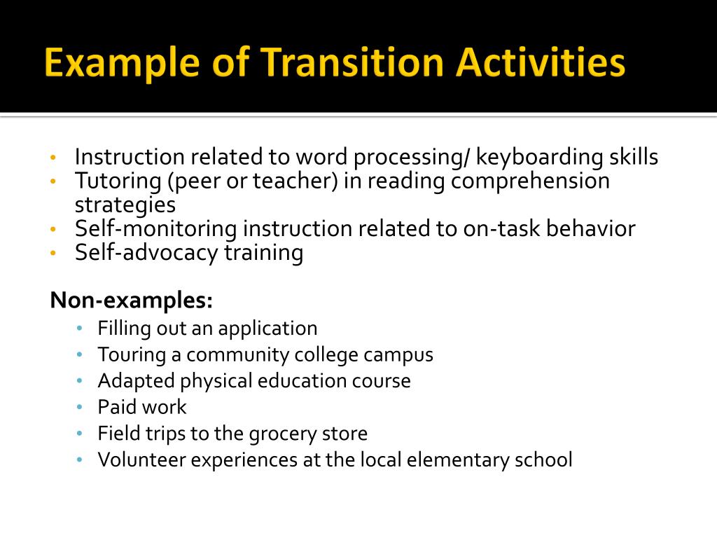 Example of Transition Activities • Instruction related to word processing/ keyboarding skills • Tutoring (peer or teacher) in reading comprehension strategies • Self-monitoring instruction related to on-task behavior • Self-advocacy training Non-examples: • Filling out an application • Touring a community college campus • Adapted physical education course • Paid work • Field trips to the grocery store • Volunteer experiences at the local elementary school