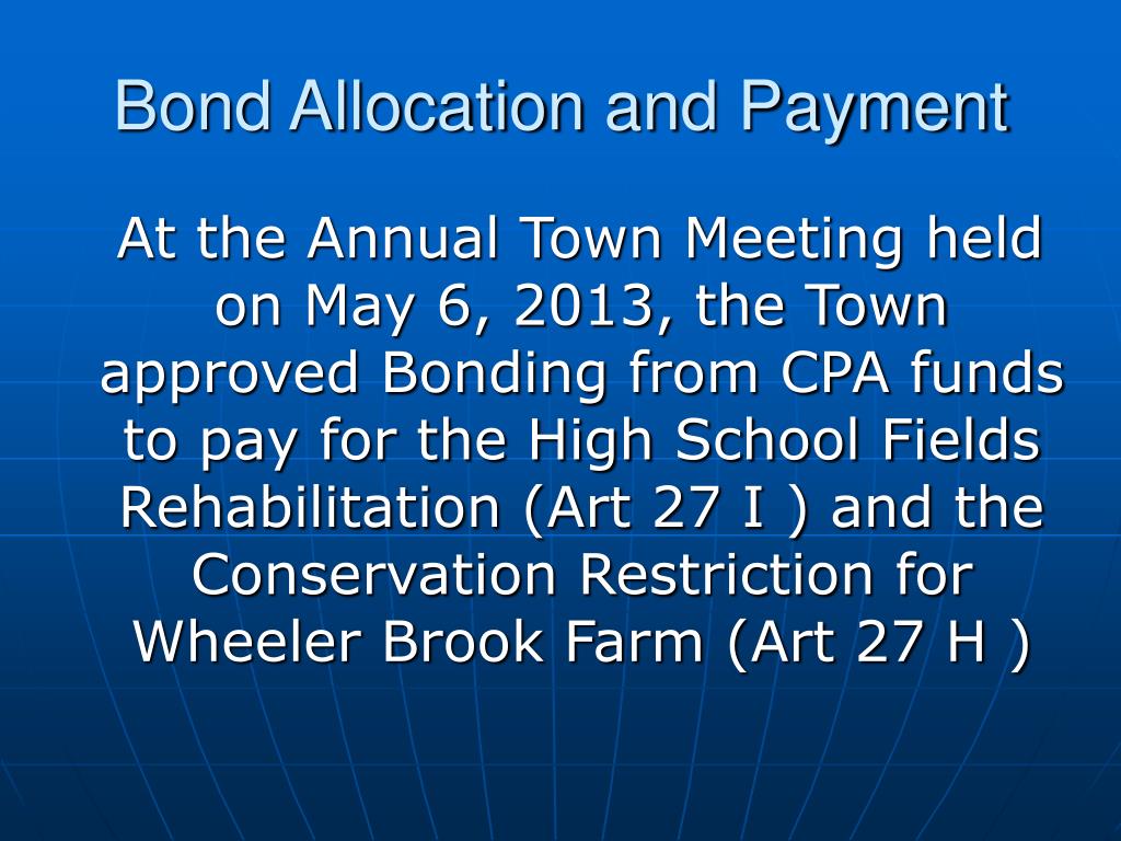 Bond Allocation and Payment At the Annual Town Meeting held on May 6, 2013, the Town approved Bonding from CPA funds to pay for the High School Fields Rehabilitation (Art 27 I ) and the Conservation Restriction for Wheeler Brook Farm (Art 27 H )