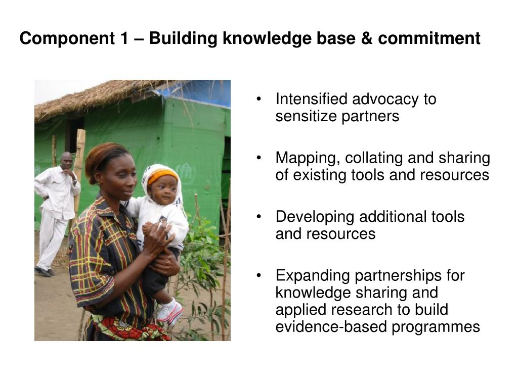 Component 1 – Building knowledge base & commitment • Intensified advocacy to sensitize partners • Mapping, collating and sharing of existing tools and resources • Developing additional tools and resources • Expanding partnerships for knowledge sharing and applied research to build evidence-based programmes