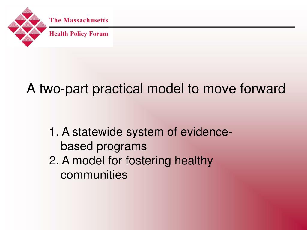 A two-part practical model to move forward 1. A statewide system of evidence-based programs 2. A model for fostering healthy communities