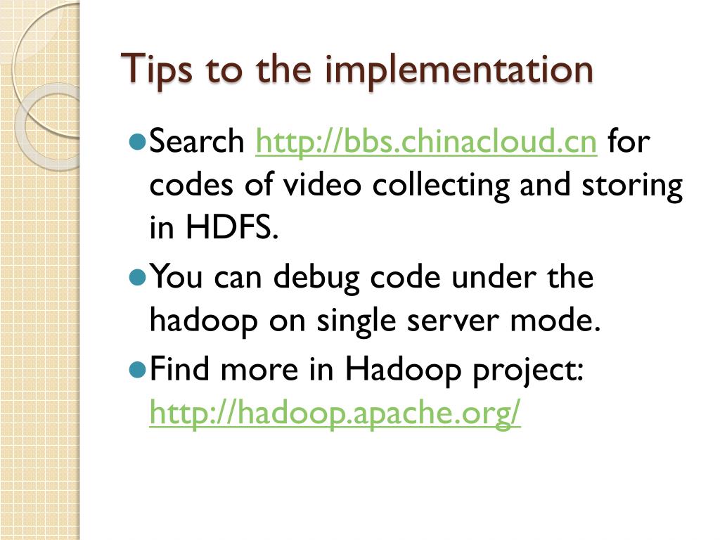 Tips to the implementation • Search http://bbs.chinacloud.cn for codes of video collecting and storing in HDFS. • You can debug code under the hadoop on single server mode. • Find more in Hadoop project: http://hadoop.apache.org/