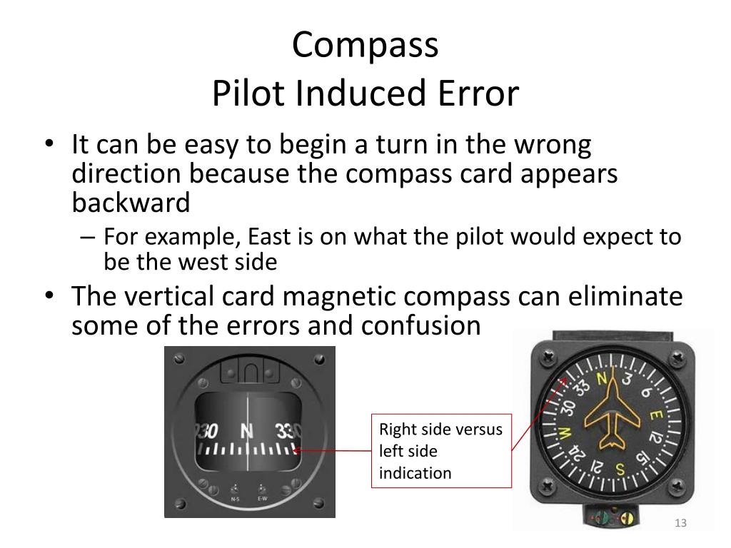 Compass Pilot Induced Error • It can be easy to begin a turn in the wrong direction because the compass card appears backward • For example, East is on what the pilot would expect to be the west side • The vertical card magnetic compass can eliminate some of the errors and confusion Right side versus left side indication