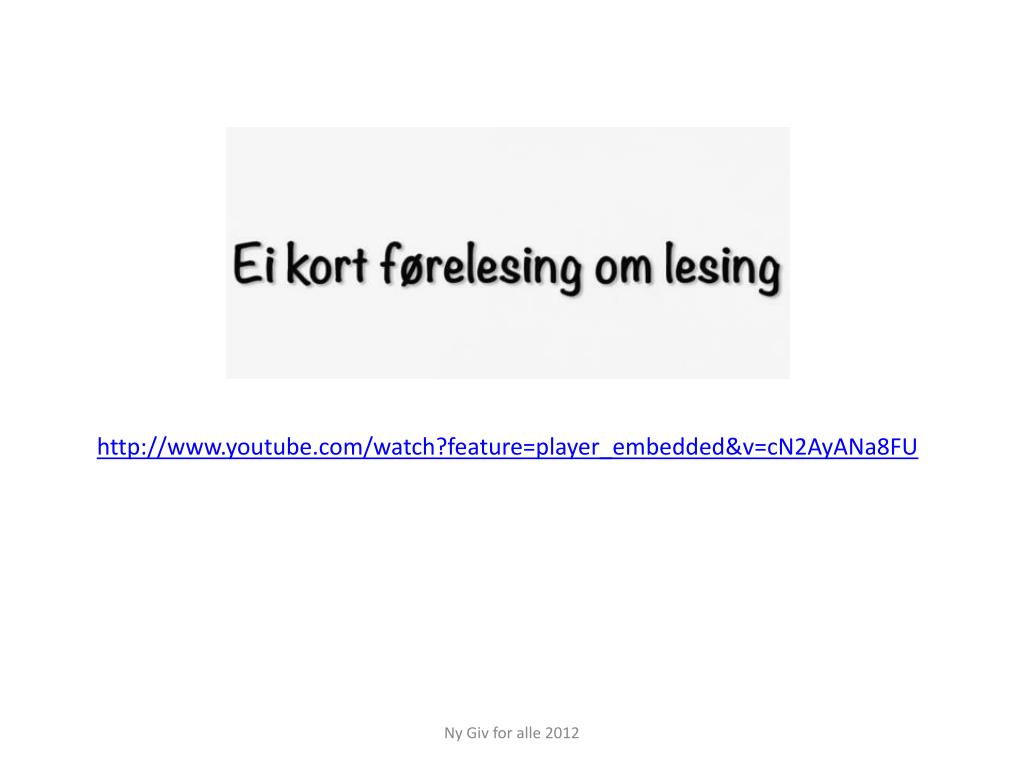 Den kyndige leseren • innstilt på å lære noe av lesingen • aktiv både før, under og etter lesingen • vet hvorfor og hvordan han leser • kan etablere forventninger til teksten og lese mellom linjene • velge lesemåte • vet nårhanforstår, oghvahankangjørenårforståelsenbrytersammen Ny Giv for alle 2012