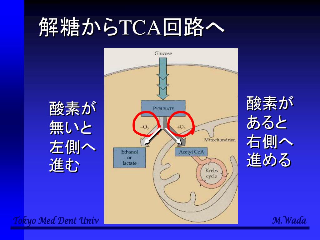 解糖からTCA回路へ 酸素があると右側へ進める 酸素が無いと左側へ進む