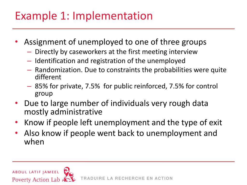 Example 1: Implementation • Assignment of unemployed to one of three groups • Directly by caseworkers at the first meeting interview • Identification and registration of the unemployed • Randomization. Due to constraints the probabilities were quite different • 85% for private, 7.5% for public reinforced, 7.5% for control group • Due to large number of individuals very rough data mostly administrative • Know if people left unemployment and the type of exit • Also know if people went back to unemployment and when
