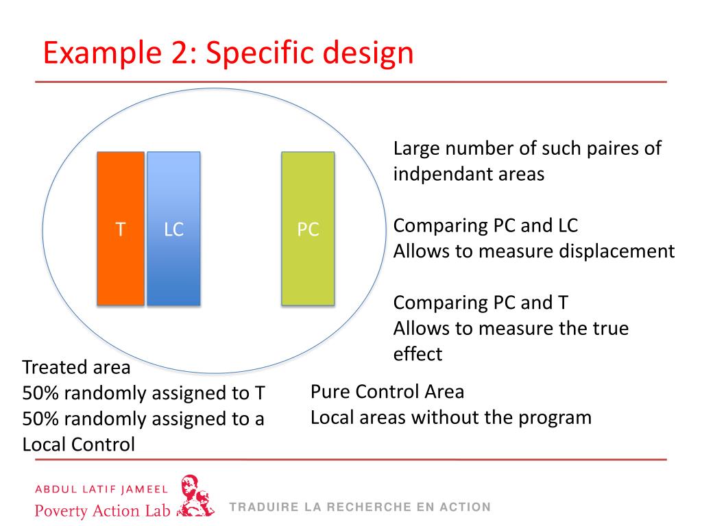 Example 2: Specific design Large number of such paires of indpendant areas Comparing PC and LC Allows to measuredisplacement Comparing PC and T Allows to measure the trueeffect T LC PC Treated area 50% randomlyassigned to T 50% randomlyassigned to a Local Control Pure Control Area Local areas without the program