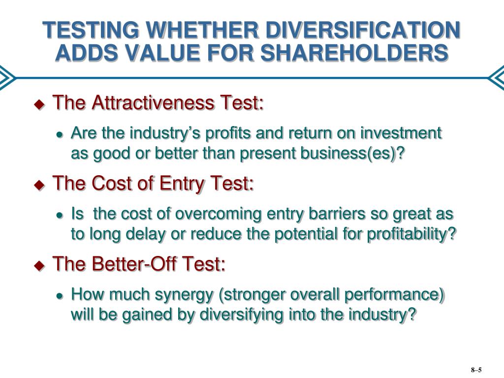TESTING WHETHER DIVERSIFICATION ADDS VALUE FOR SHAREHOLDERS • The Attractiveness Test: • Are the industry’s profits and return on investment as good or better than present business(es)? • The Cost of Entry Test: • Is the cost of overcoming entry barriers so great as to long delay or reduce the potential for profitability? • The Better-Off Test: • How much synergy (stronger overall performance) will be gained by diversifying into the industry? 8–5