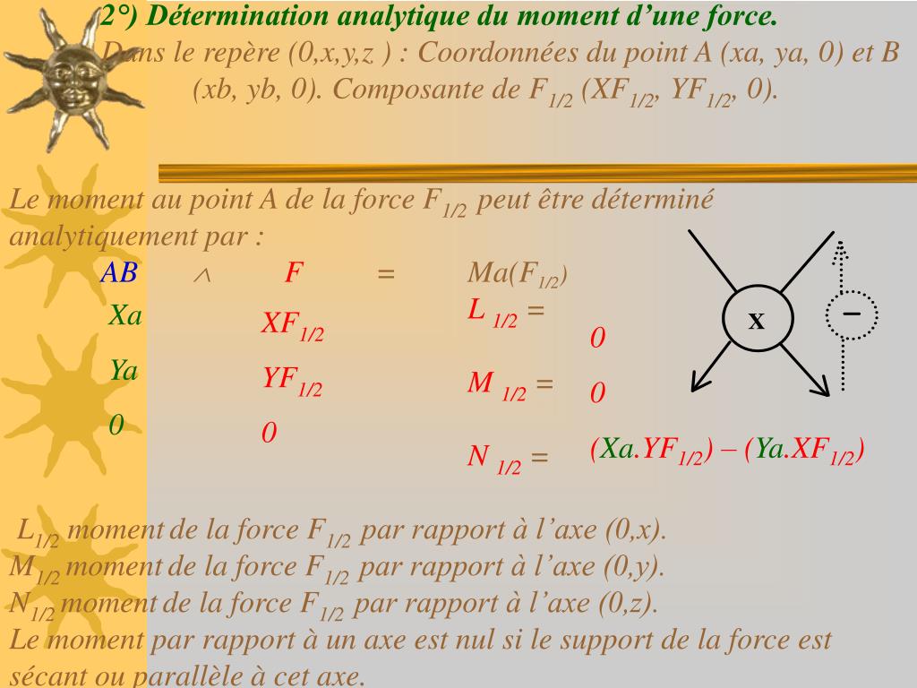 2°) Détermination analytique du moment d’une force.Dans le repère (0,x,y,z ) : Coordonnées du point A (xa, ya, 0) et B (xb, yb, 0). Composante de F1/2 (XF1/2, YF1/2, 0).Le moment au point A de la force F1/2 peut être déterminé analytiquement par :ABF = Ma(F1/2)L 1/2 =M 1/2 = N 1/2 = L1/2 momentde la force F1/2 par rapport à l’axe (0,x).M1/2 momentde la force F1/2 par rapport à l’axe (0,y).N1/2 momentde la force F1/2 par rapport à l’axe (0,z).Le moment par rapport à un axe est nul si le support de la force est sécant ou parallèle à cet axe. Xa Ya 0 XF1/2 YF1/2 0 0 0 (Xa.YF1/2) – (Ya.XF1/2)