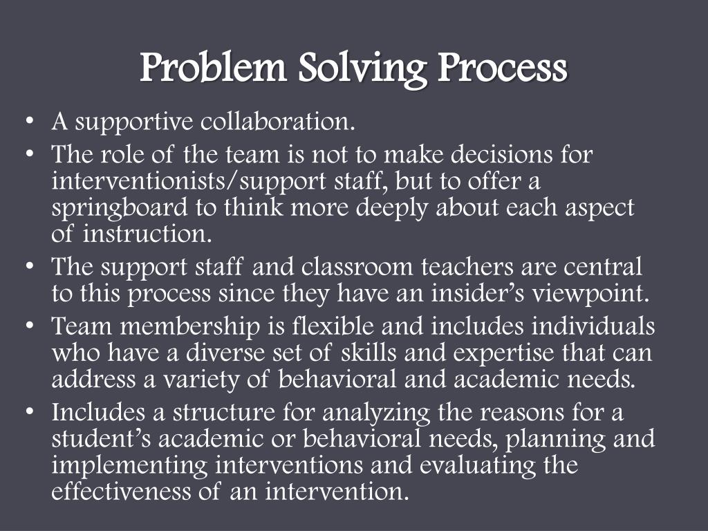 Problem Solving Process • A supportive collaboration. • The role of the team is not to make decisions for interventionists/support staff, but to offer a springboard to think more deeply about each aspect of instruction. • The support staff and classroom teachers are central to this process since they have an insider’s viewpoint. • Team membership is flexible and includes individuals who have a diverse set of skills and expertise that can address a variety of behavioral and academic needs. • Includes a structure for analyzing the reasons for a student’s academic or behavioral needs, planning and implementing interventions and evaluating the effectiveness of an intervention.