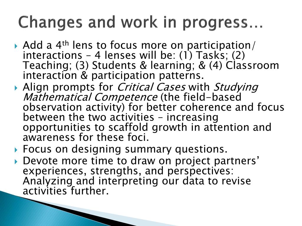 Changes and work in progress… • Add a 4th lens to focus more on participation/ interactions – 4 lenses will be: (1) Tasks; (2) Teaching; (3) Students & learning; & (4) Classroom interaction & participation patterns. • Align prompts for Critical Cases with Studying Mathematical Competence (the field-based observation activity) for better coherence and focus between the two activities – increasing opportunities to scaffold growth in attention and awareness for these foci. • Focus on designing summary questions. • Devote more time to draw on project partners’ experiences, strengths, and perspectives: Analyzing and interpreting our data to revise activities further.