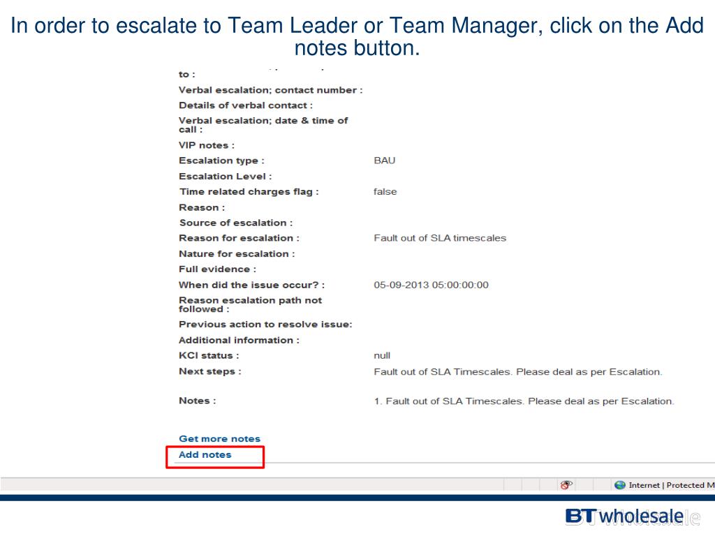 BT Wholesale Broadband Escalations Portal Escalating to Team Leader / Manager. In order to escalate to Team Leader or Team Manager, click on the Add notes button. You can also escalate to Team Leader or Team Manager if you are on this screen also by clicking on the Add notes button.