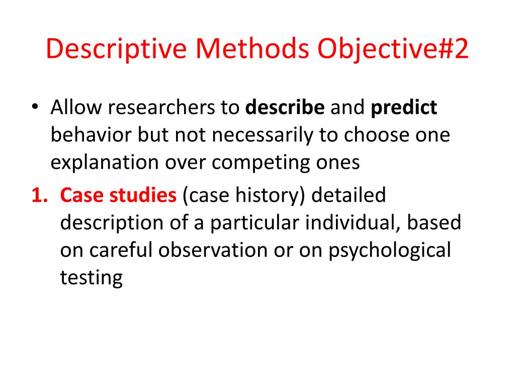 Descriptive Methods Objective#2 • Allow researchers to describe and predict behavior but not necessarily to choose one explanation over competing ones • Case studies(case history) detailed description of a particular individual, based on careful observation or on psychological testing