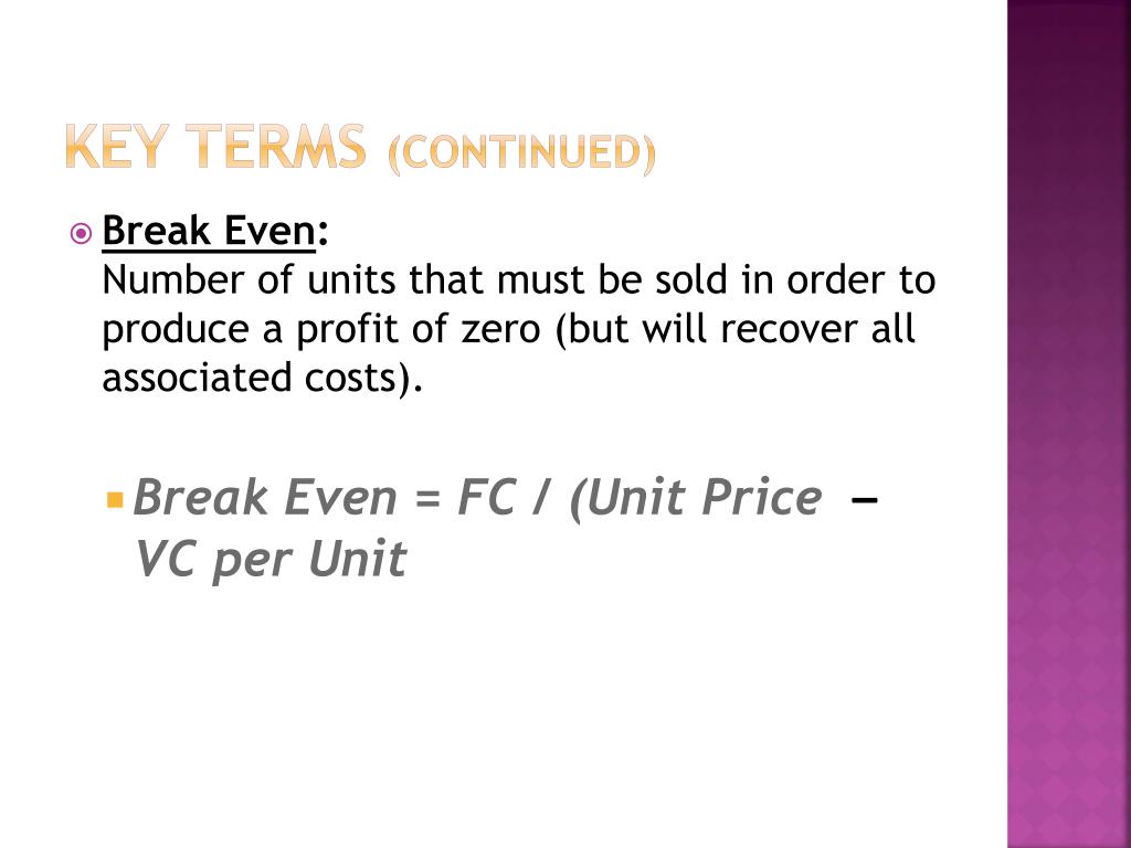 Key Terms (continued) • Break Even:Number of units that must be sold in order to produce a profit of zero (but will recover all associated costs). • Break Even = FC / (Unit Price –VC per Unit