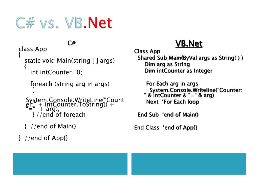 C# vs. VB.Net C# class App { static void Main(string [ ] args) { intintCounter=0; foreach (string arg in args) { System.Console.WriteLine(“Counter:” + intCounter.ToString() + “=“ + arg); } //end of foreach } //end of Main() } //end of App{} VB.Net Class App Shared Sub Main(ByValargs as String( ) ) Dim arg as String Dim intCounter as Integer For Each arg in args System.Console.Writeline(“Counter: ” & intCounter & “=“ & arg) Next ‘For Each loop End Sub ‘end of Main() End Class ‘end of App{}