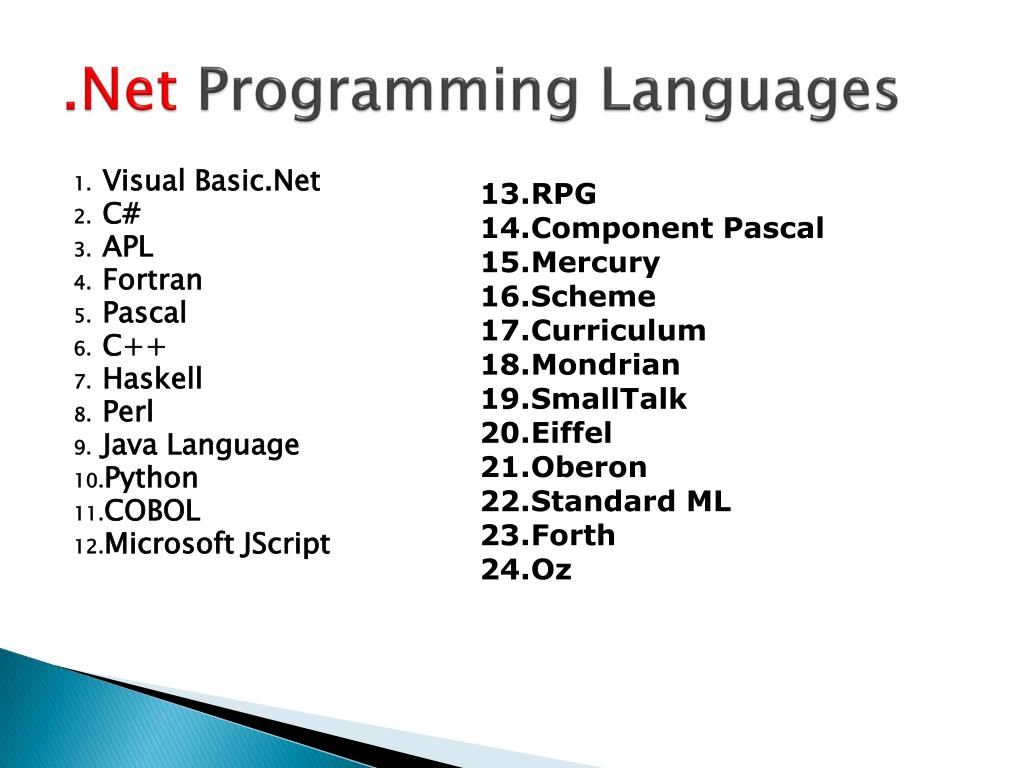 .Net Programming Languages • Visual Basic.Net • C# • APL • Fortran • Pascal • C++ • Haskell • Perl • Java Language • Python • COBOL • Microsoft JScript • RPG • Component Pascal • Mercury • Scheme • Curriculum • Mondrian • SmallTalk • Eiffel • Oberon • Standard ML • Forth • Oz