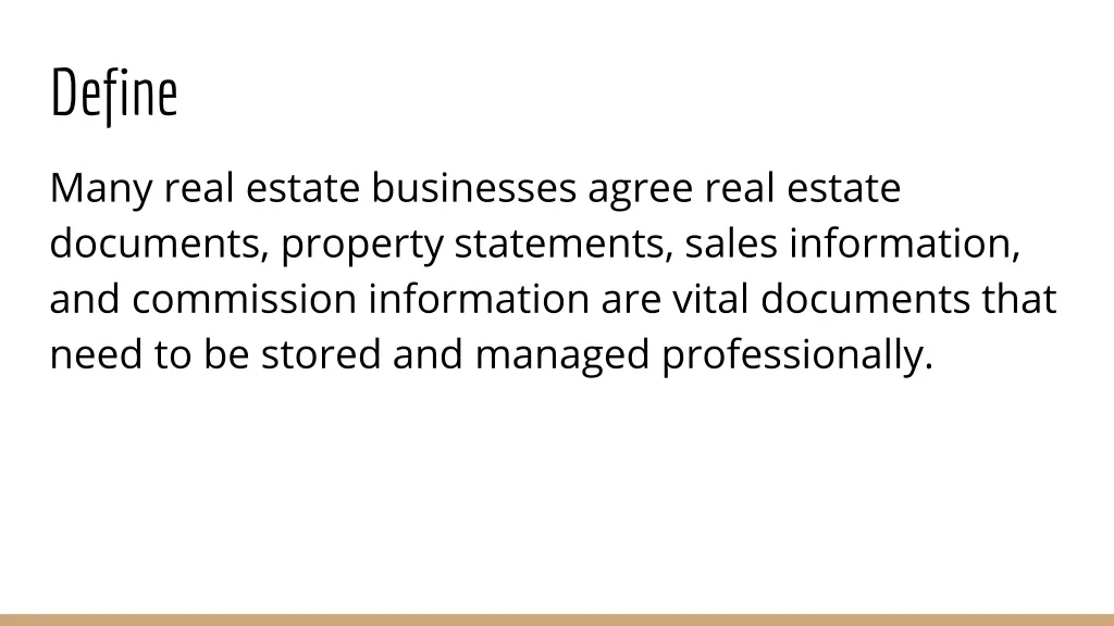 Define Many real estate businesses agree real estate documents, property statements, sales information, and commission information are vital documents that need to be stored and managed professionally.