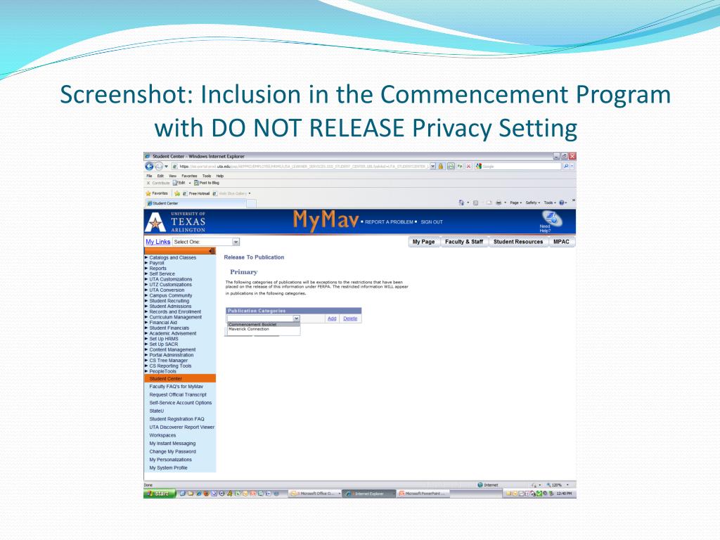 Impact of Withholding Release • Students who request restrictions to their record will not be included in the following: • Microsoft-hosted Student Email system (address book that allows student-to-student access) • UT Arlington web site “Find People” • UT Arlington printed Campus Directory “Maverick Connection” • Requests from external entities seeking directory information on UTA students whose requests are approved by the custodian of records for UT Arlington • Commencement program • However, restriction will not impact participation in Mav Alert