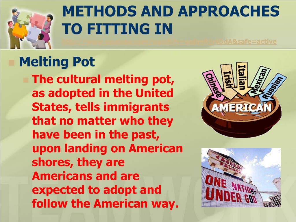 METHODS AND APPROACHES TO FITTING IN http://www.youtube.com/watch?v=eq0mRjv4DdA&safe=active • Melting Pot • The cultural melting pot, as adopted in the United States, tells immigrants that no matter who they have been in the past, upon landing on American shores, they are Americans and are expected to adopt and follow the American way.