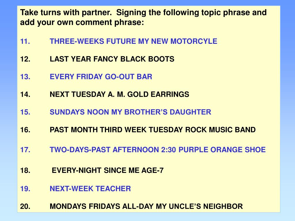 Take turns with partner. Signing the following topic phrase and add your own comment phrase: 11. THREE-WEEKS FUTURE MY NEW MOTORCYLE 12. LAST YEAR FANCY BLACK BOOTS 13. EVERY FRIDAY GO-OUT BAR 14. NEXT TUESDAY A. M. GOLD EARRINGS 15. SUNDAYS NOON MY BROTHER’S DAUGHTER 16. PAST MONTH THIRD WEEK TUESDAY ROCK MUSIC BAND 17. TWO-DAYS-PAST AFTERNOON 2:30PURPLE ORANGE SHOE18. EVERY-NIGHTSINCE ME AGE-7 19. NEXT-WEEK TEACHER 20. MONDAYS FRIDAYS ALL-DAY MY UNCLE’S NEIGHBOR