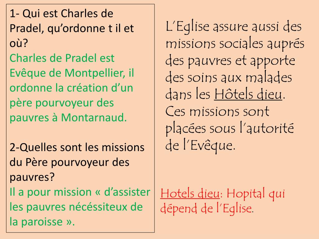 1- Qui est Charles de Pradel, qu’ordonne t il et où? Charles de Pradel est Evêque de Montpellier, il ordonne la création d’un père pourvoyeur des pauvres à Montarnaud. 2-Quelles sont les missions du Père pourvoyeur des pauvres? Il a pour mission « d’assister les pauvres nécéssiteux de la paroisse ». L’Eglise assure aussi des missions sociales auprés des pauvres et apporte des soins aux malades dans les Hôtels dieu. Ces missions sont placées sous l’autorité de l’Evêque. Hotels dieu: Hopital qui dépend de l’Eglise.