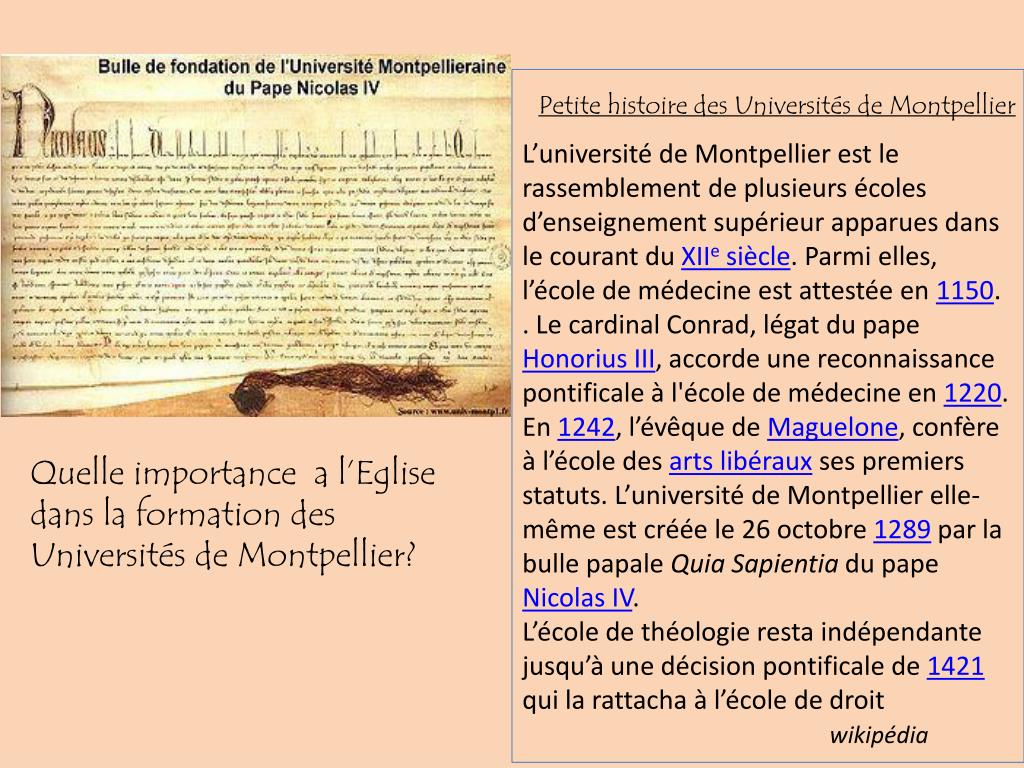 L’université de Montpellier est le rassemblement de plusieurs écoles d’enseignement supérieur apparues dans le courant du XIIe siècle. Parmi elles, l’école de médecine est attestée en 1150. . Le cardinal Conrad, légat du pape Honorius III, accorde une reconnaissance pontificale à l'école de médecine en 1220. En 1242, l’évêque de Maguelone, confère à l’école des arts libéraux ses premiers statuts. L’université de Montpellier elle-même est créée le 26 octobre 1289 par la bulle papale Quia Sapientia du pape Nicolas IV. L’école de théologie resta indépendante jusqu’à une décision pontificale de 1421 qui la rattacha à l’école de droit wikipédia Petite histoire des Universités de Montpellier Quelle importance a l’Eglise dans la formation des Universités de Montpellier?