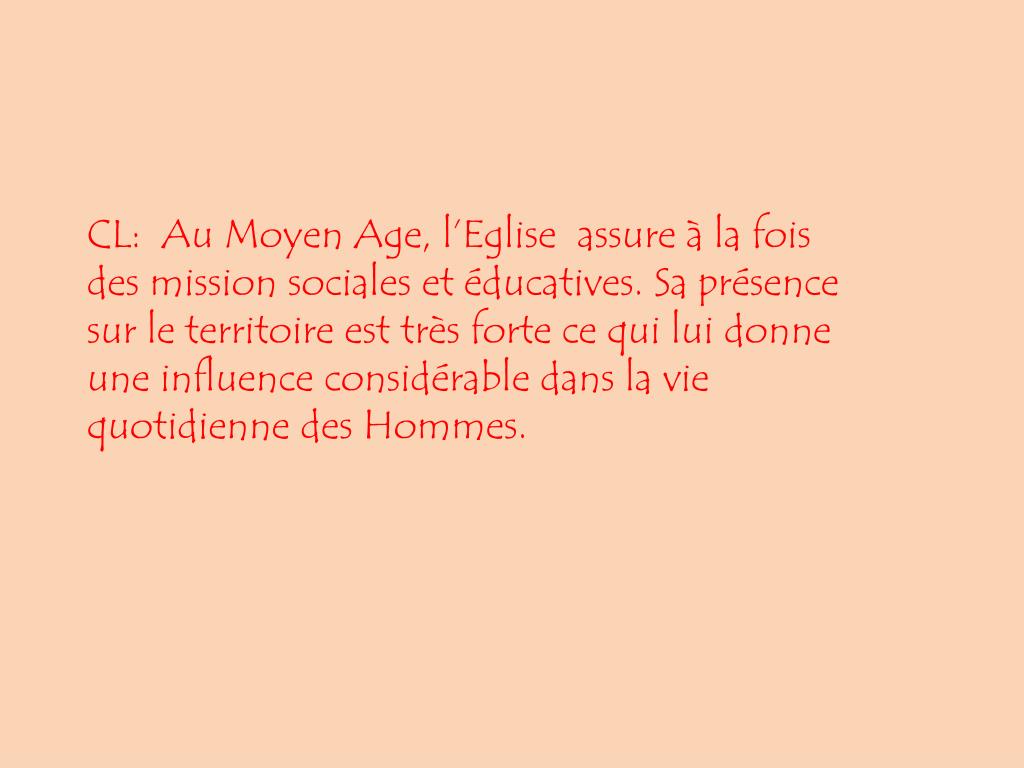 CL: Au Moyen Age, l’Eglise assure à la fois des mission sociales et éducatives. Sa présence sur le territoire est très forte ce qui lui donne une influence considérable dans la vie quotidienne des Hommes.