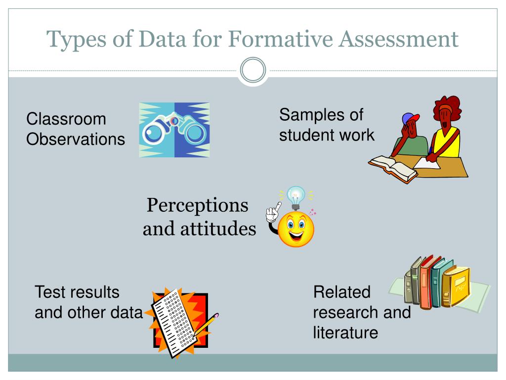 Types of Data for Formative Assessment Perceptions and attitudes Samples of student work Classroom Observations Test results and other data Related research and literature