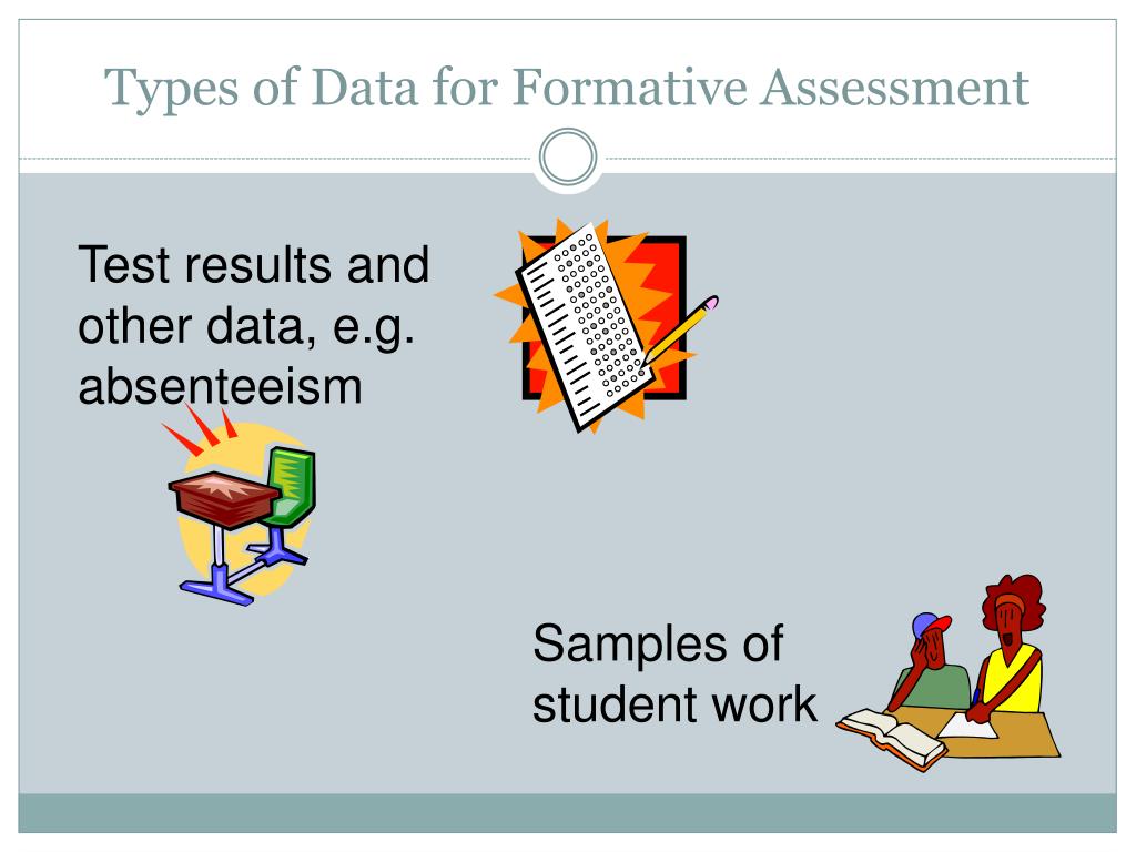 Types of Data for Formative Assessment Test results and other data, e.g. absenteeism Samples of student work