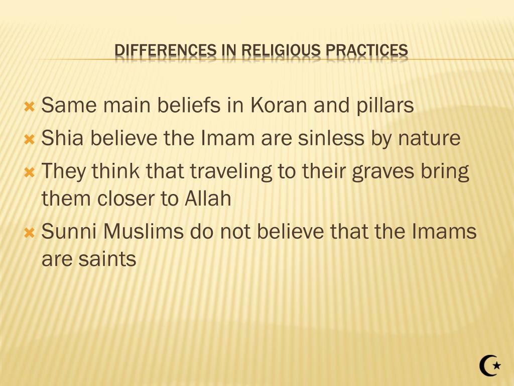 Same main beliefs in Koran and pillars • Shia believe the Imam are sinless by nature • They think that traveling to their graves bring them closer to Allah • Sunni Muslims do not believe that the Imams are saints Differences in religious practices