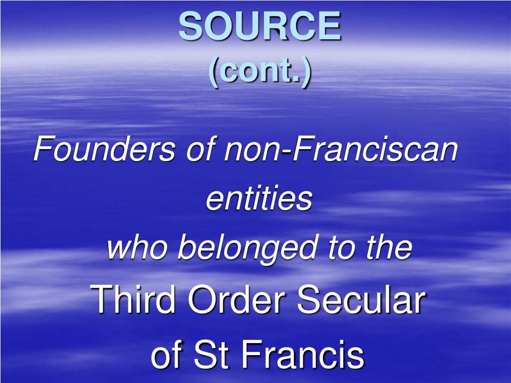 SOURCE(cont.) Founders of Franciscan entities who belonged to: • Third Order Regular of St Francis • Third Order Secular of St Francis