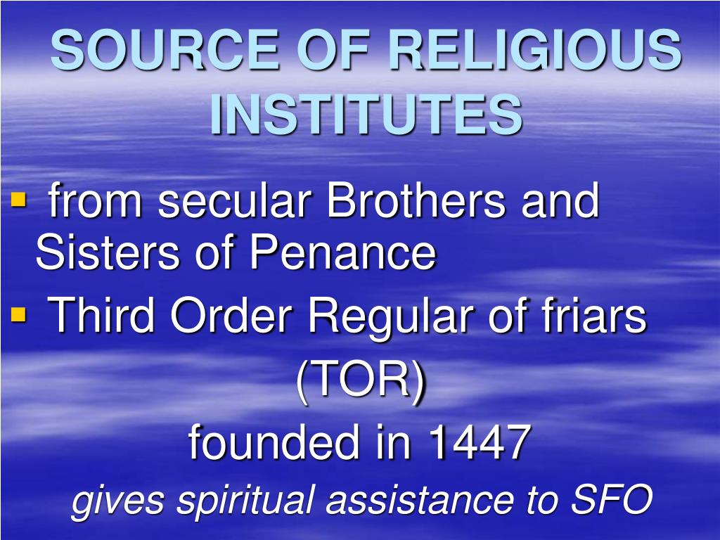 SOURCE OF RELIGIOUS INSTITUTES • from secular Brothers and Sisters of Penance • Third Order Regular of friars (TOR) founded in 1447 gives spiritual assistance to SFO