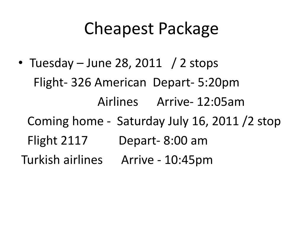 Cheapest Package • Tuesday – June 28, 2011 / 2 stops Flight- 326 American Depart- 5:20pm Airlines Arrive- 12:05am Coming home - Saturday July 16, 2011 /2 stop Flight 2117 Depart- 8:00 am Turkish airlines Arrive - 10:45pm