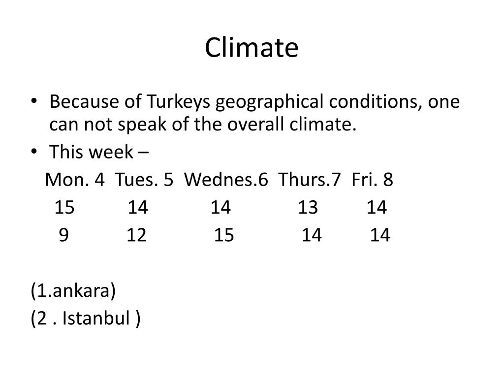 Climate • Because of Turkeys geographical conditions, one can not speak of the overall climate. • This week – Mon. 4 Tues. 5 Wednes.6 Thurs.7 Fri. 8 15 14 14 13 14 9 12 15 14 14 (1.ankara) (2 . Istanbul )