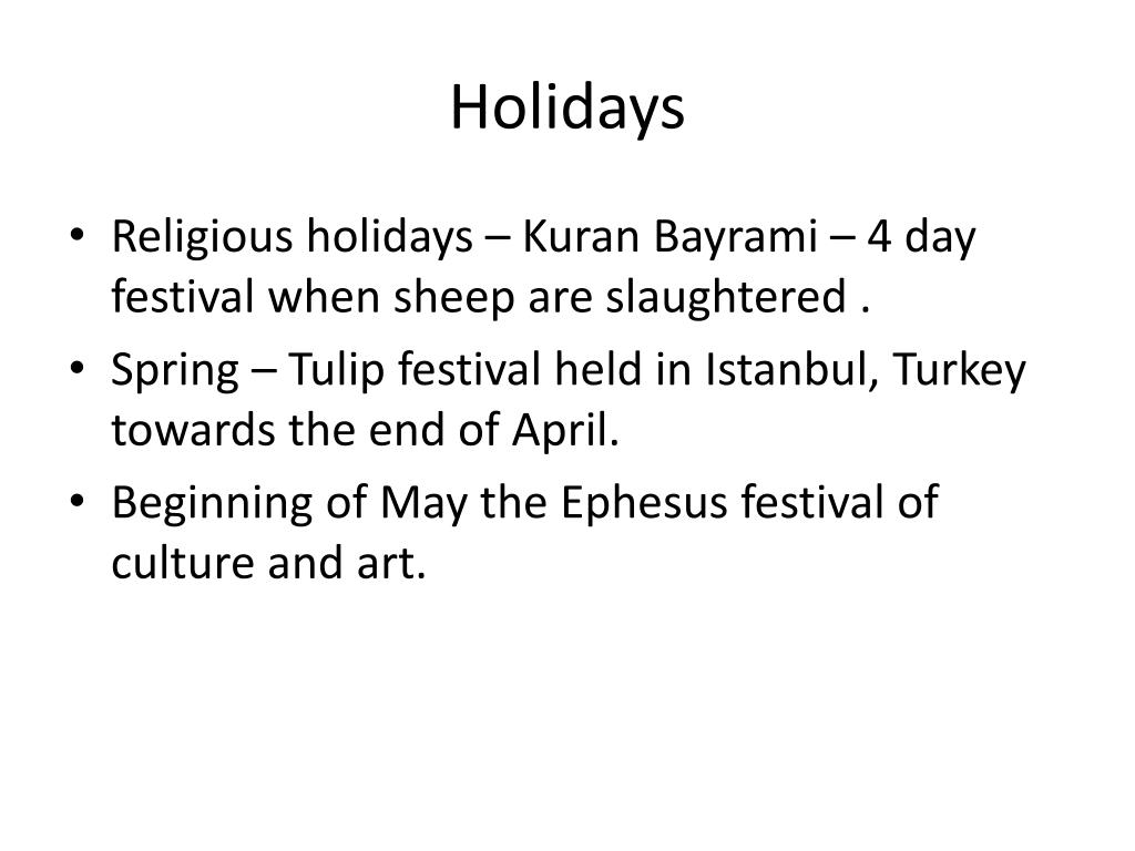 Holidays • Religious holidays – KuranBayrami – 4 day festival when sheep are slaughtered . • Spring – Tulip festival held in Istanbul, Turkey towards the end of April. • Beginning of May the Ephesus festival of culture and art.