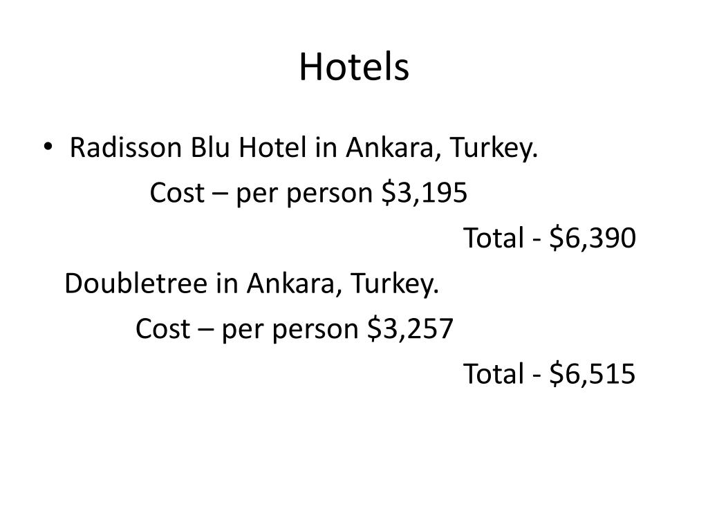Hotels • Radisson Blu Hotel in Ankara, Turkey. Cost – per person $3,195 Total - $6,390 Doubletree in Ankara, Turkey. Cost – per person $3,257 Total - $6,515