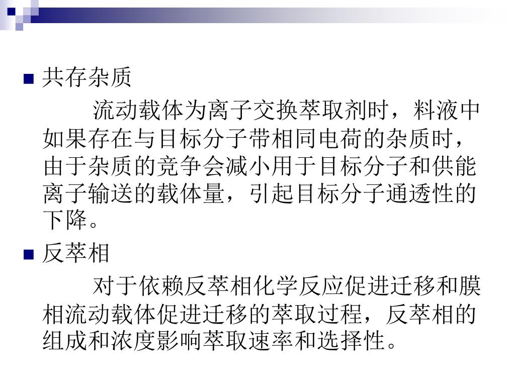 共存杂质 流动载体为离子交换萃取剂时,料液中如果存在与目标分子带相同电荷的杂质时,由于杂质的竞争会减小用于目标分子和供能离子输送的载体量,引起目标分子通透性的下降。 • 反萃相 对于依赖反萃相化学反应促进迁移和膜相流动载体促进迁移的萃取过程,反萃相的组成和浓度影响萃取速率和选择性。