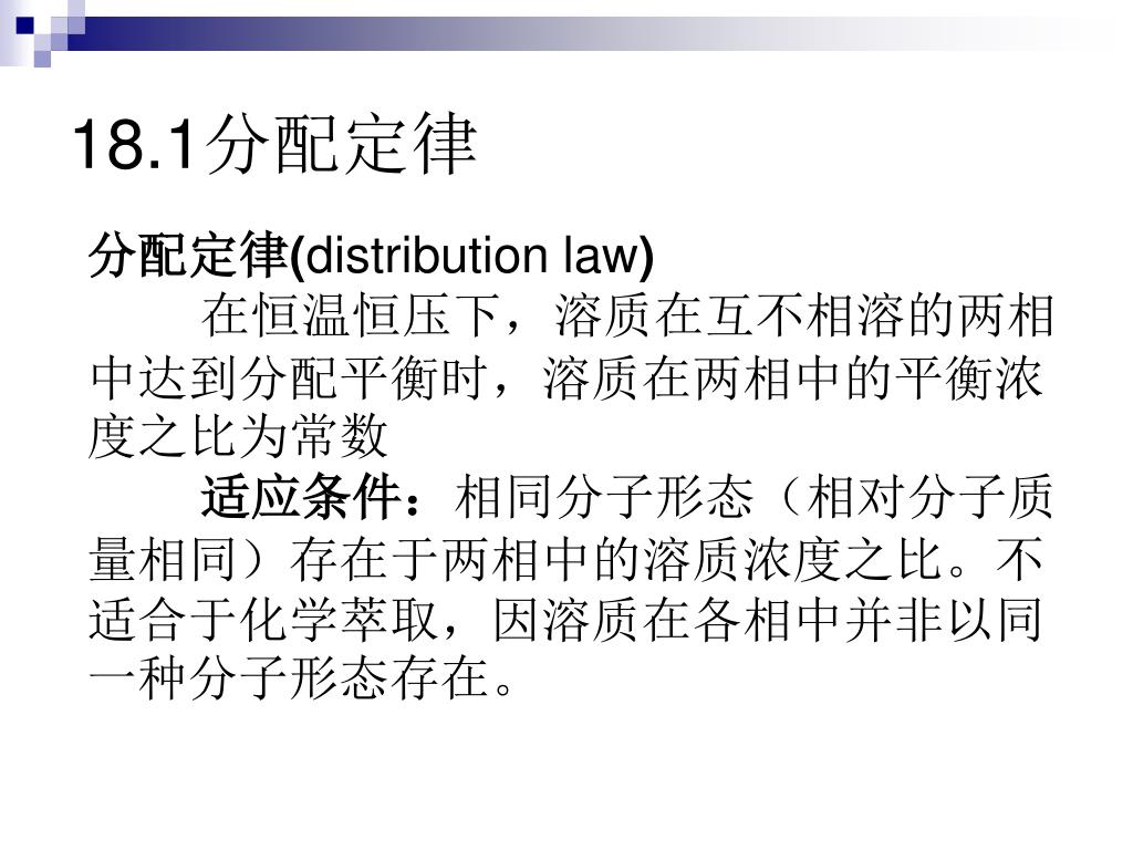 18.1分配定律 分配定律(distribution law) 在恒温恒压下,溶质在互不相溶的两相中达到分配平衡时,溶质在两相中的平衡浓度之比为常数 适应条件:相同分子形态(相对分子质量相同)存在于两相中的溶质浓度之比。不适合于化学萃取,因溶质在各相中并非以同一种分子形态存在。