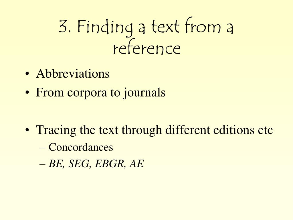 3. Finding a text from a reference • Abbreviations • From corpora to journals • Tracing the text through different editions etc • Concordances • BE, SEG, EBGR, AE