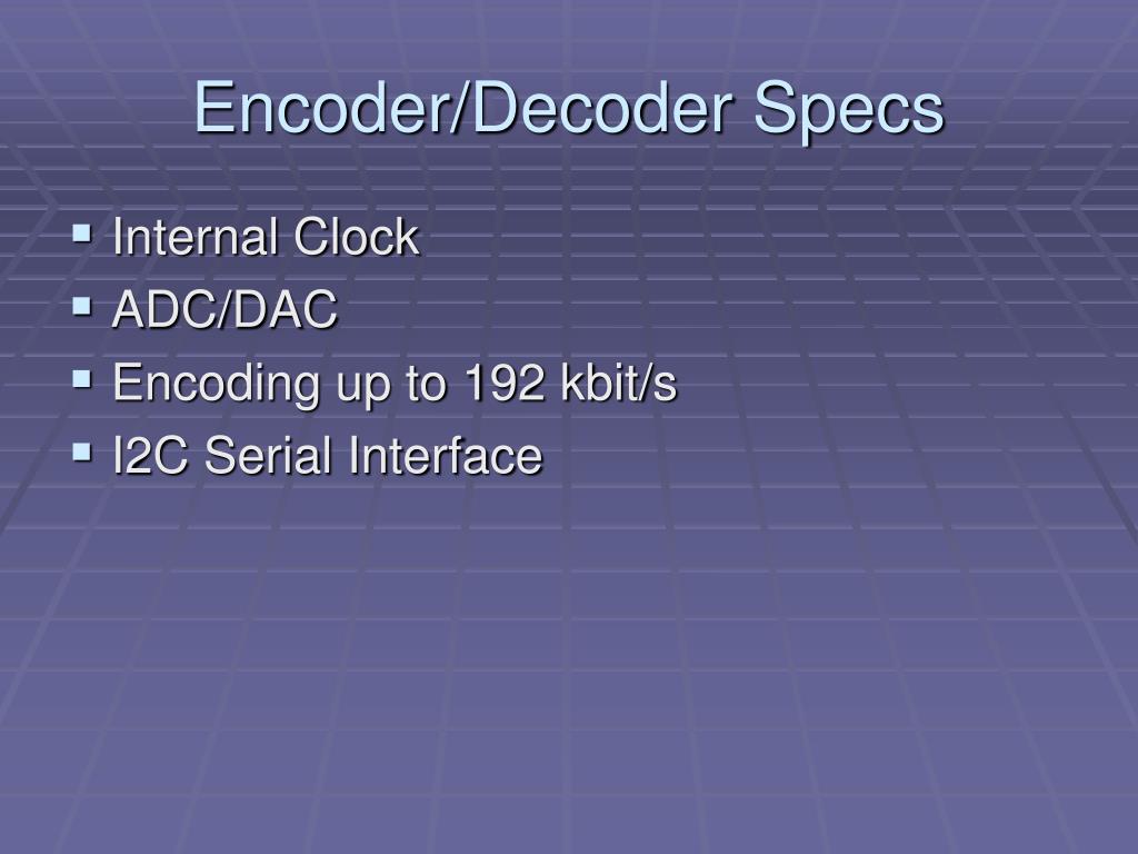 Encoder/Decoder Specs • Internal Clock • ADC/DAC • Encoding up to 192 kbit/s • I2C Serial Interface