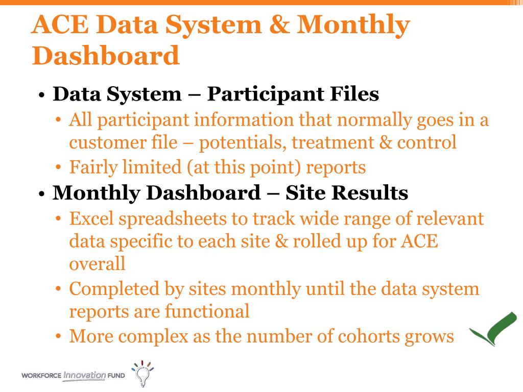 ACE Data System & Monthly Dashboard • Data System – Participant Files • All participant information that normally goes in a customer file – potentials, treatment & control • Fairly limited (at this point) reports • Monthly Dashboard – Site Results • Excel spreadsheets to track wide range of relevant data specific to each site & rolled up for ACE overall • Completed by sites monthly until the data system reports are functional • More complex as the number of cohorts grows