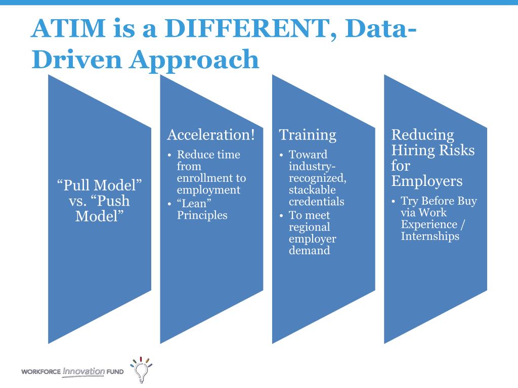 Employer Demand-Driven “Pull Model” Q: What determines the type and quantity of training offered in a region? A: LMI & Employer Data Employer involvement CRITICALThe Workforce System must know: Occupations Skills / Competencies Timing Quantity Location