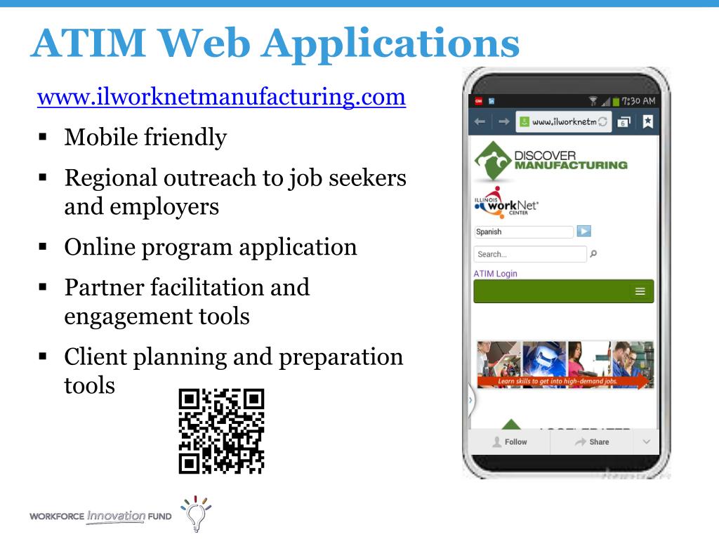 www.ilworknetmanufacturing.com • Mobile friendly • Regional outreach to job seekers and employers • Online program application • Partner facilitation and engagement tools • Client planning and preparation tools ATIM Web Applications