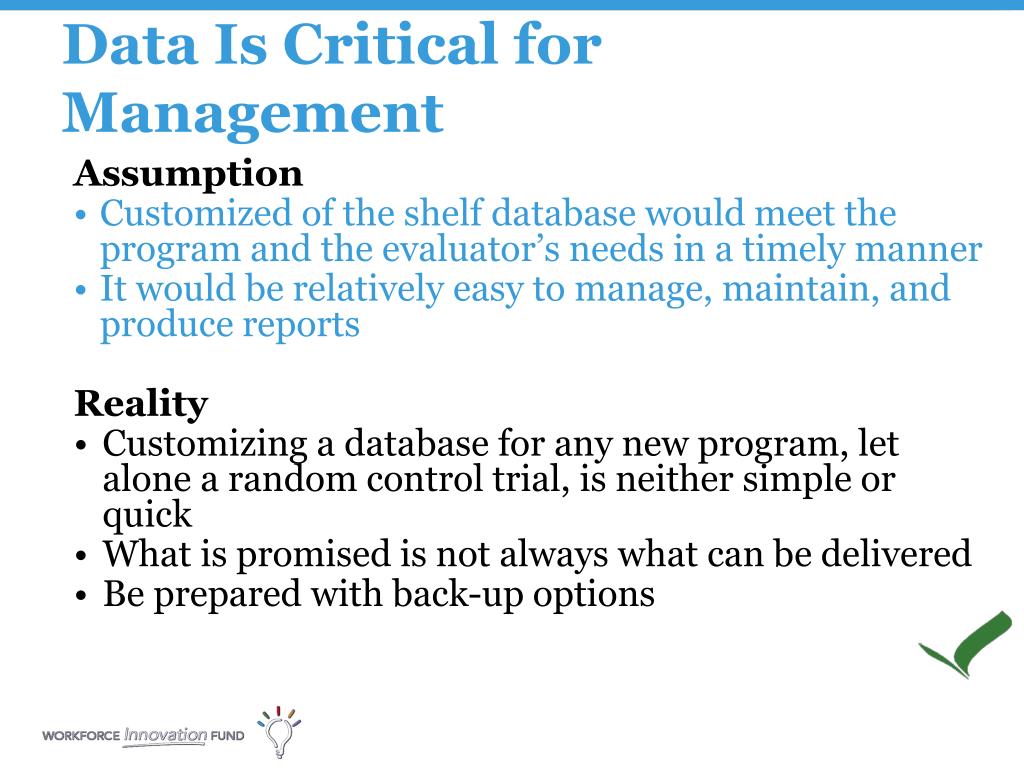 Data Is Critical for Management Assumption • Customized of the shelf database would meet the program and the evaluator’s needs in a timely manner • It would be relatively easy to manage, maintain, and produce reports Reality • Customizing a database for any new program, let alone a random control trial, is neither simple or quick • What is promised is not always what can be delivered • Be prepared with back-up options