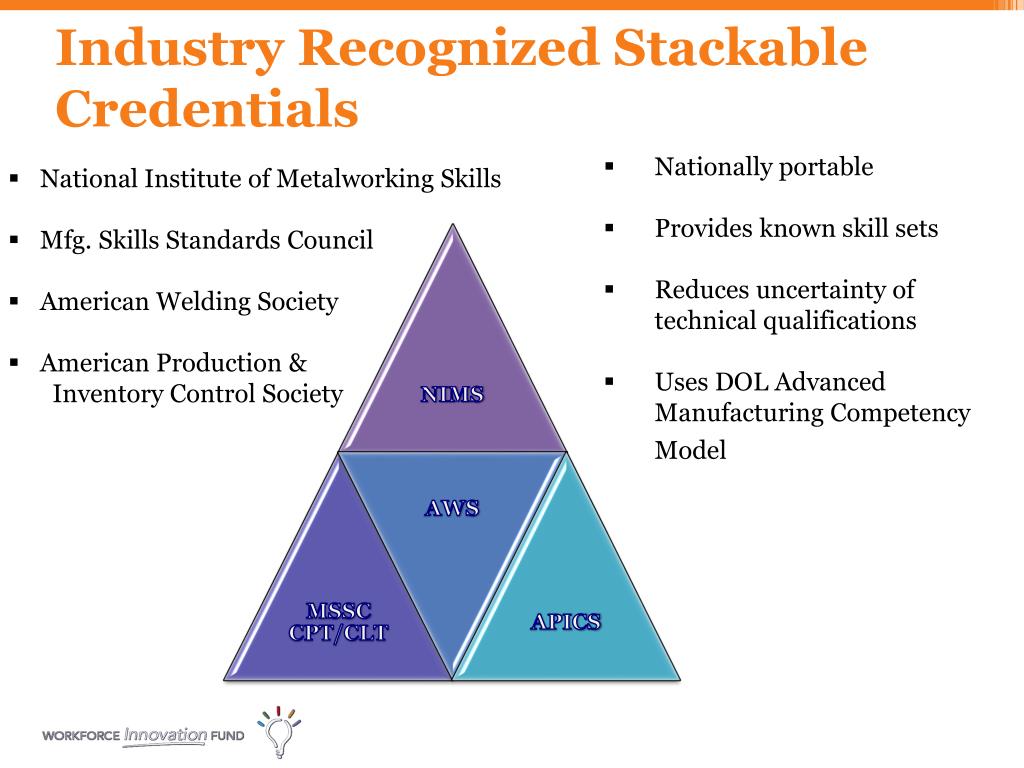 Industry Recognized Stackable Credentials • Nationally portable • Provides known skill sets • Reduces uncertainty of technical qualifications • Uses DOL Advanced Manufacturing Competency Model • National Institute of Metalworking Skills • Mfg. Skills Standards Council • American Welding Society • American Production & Inventory Control Society