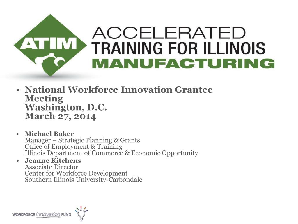 National Workforce Innovation Grantee MeetingWashington, D.C.March 27, 2014 • Michael BakerManager – Strategic Planning & GrantsOffice of Employment & TrainingIllinois Department of Commerce & Economic Opportunity • Jeanne KitchensAssociate DirectorCenter for Workforce DevelopmentSouthern Illinois University-Carbondale