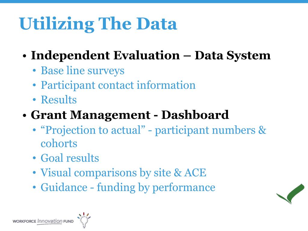 Utilizing The Data • Independent Evaluation – Data System • Base line surveys • Participant contact information • Results • Grant Management - Dashboard • “Projection to actual” - participant numbers & cohorts • Goal results • Visual comparisons by site & ACE • Guidance - funding by performance