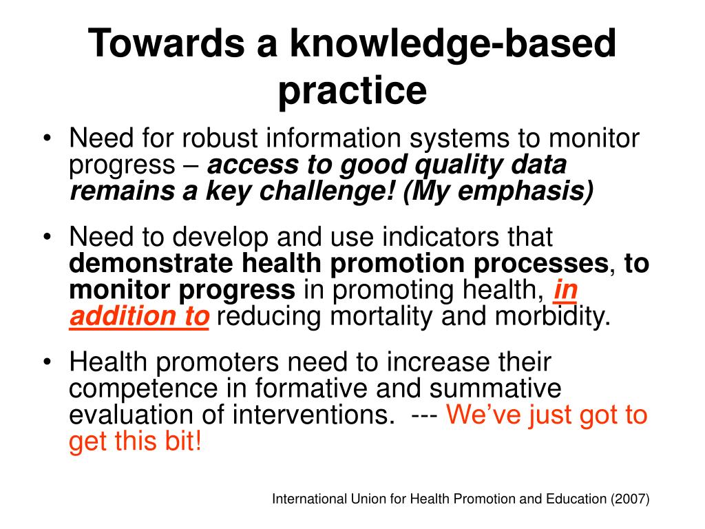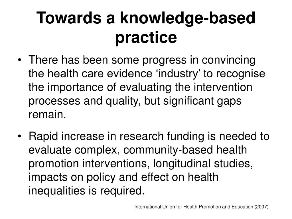 Towards a knowledge-based practice • There has been some progress in convincing the health care evidence ‘industry’ to recognise the importance of evaluating the intervention processes and quality, but significant gaps remain. • Rapid increase in research funding is needed to evaluate complex, community-based health promotion interventions, longitudinal studies, impacts on policy and effect on health inequalities is required. International Union for Health Promotion and Education (2007)