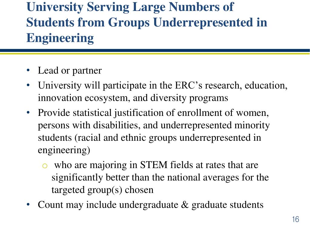 University Serving Large Numbers of Students from Groups Underrepresented in Engineering • Lead or partner • University will participate in the ERC’s research, education, innovation ecosystem, and diversity programs • Provide statistical justification of enrollment of women, persons with disabilities, and underrepresented minority students (racial and ethnic groups underrepresented in engineering) • who are majoring in STEM fields at rates that are significantly better than the national averages for the targeted group(s) chosen • Count may include undergraduate & graduate students